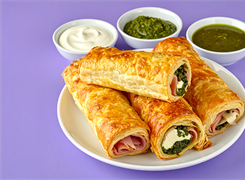 Estos rollitos con Jamón de Cerdo Maestro Lorenzano son el pasabocas perfecto: fáciles, crujientes y con un toque de pesto irresistible.